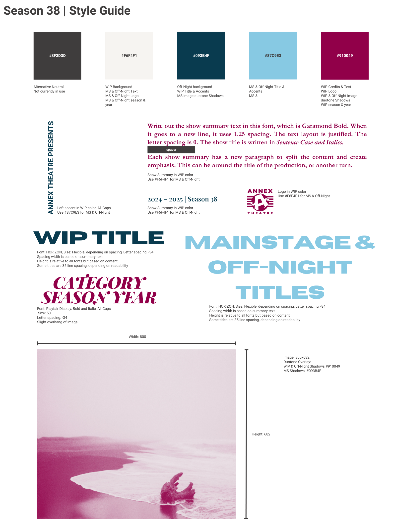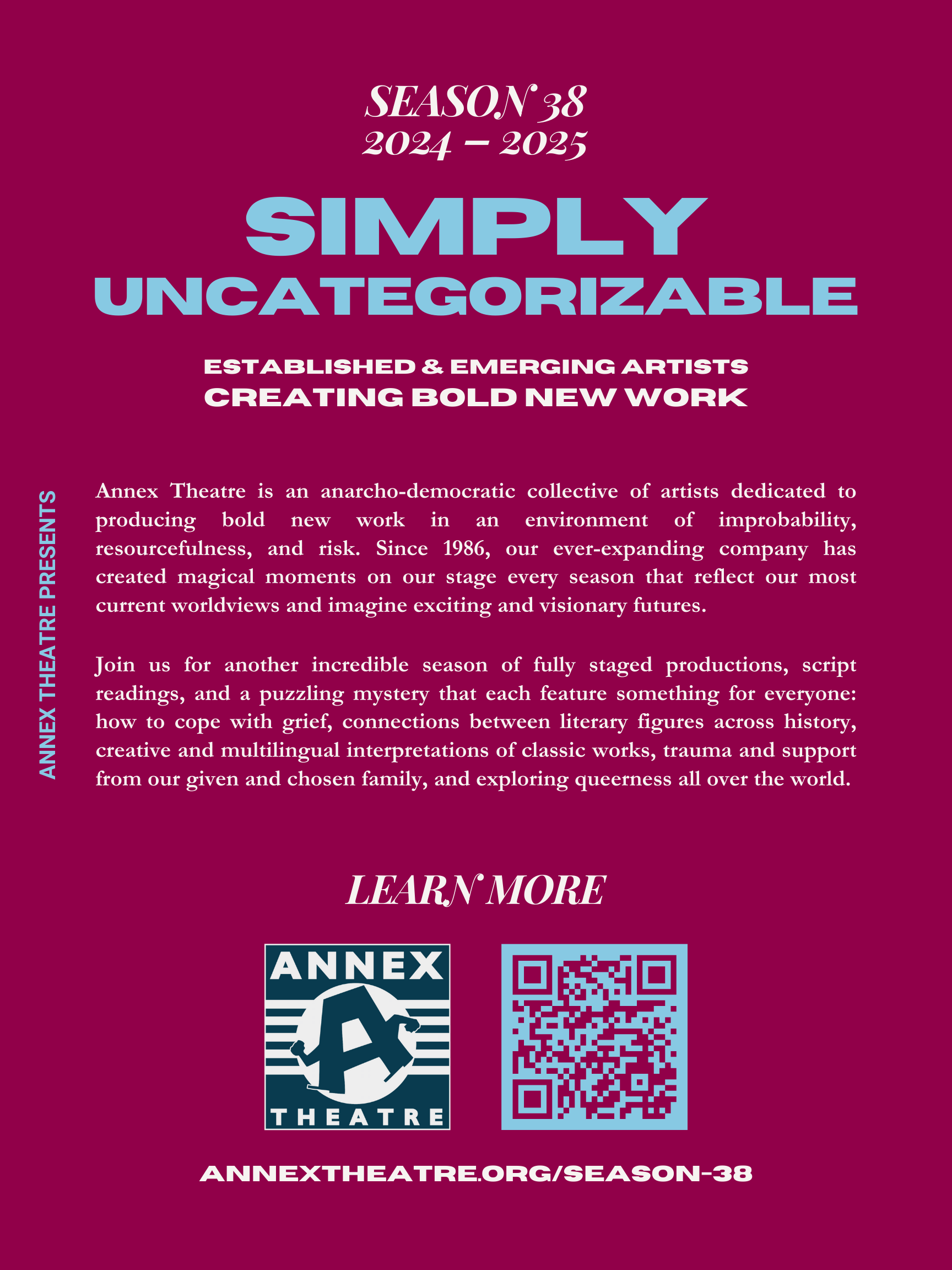 December 2, 2024In 2024, Annex Theatre selected its first full season of productions after the COVID-19 pandemic/lockdown era. Although we had started to skip counting seasons in the interim, dubbing the next period Season 38 (2024 – 2025) caught us up to Annex Theatre’s “age” (which will be 40 in 2026). As the current Marketing Director and person in charge of social media, website management, and email communications, I was excited to take on the designs for a season announcement, but was struggling with how to find a common thread between the shows, especially since they weren’t all plays. For the first time in many years, there will be staged readings with talkbacks and off-night productions alongside full mainstage productions.
