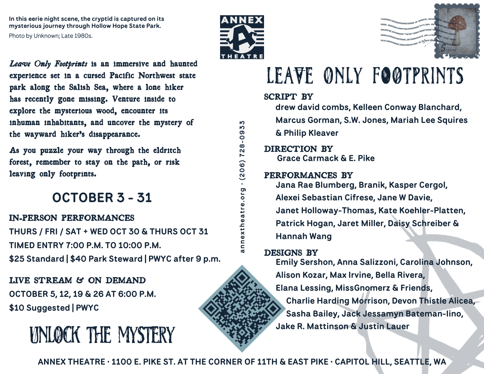 In October 2024, I directed the Marketing for Leave Only Footprints at Annex Theatre, an immersive and haunted house experience. I implemented a cohesive campaign of visual storytelling, promotional strategy, and an atmospheric design to bring the eerie mystery narrative of a missing hiker who encounters cryptids in a Pacific Northwest state park to sold-out audiences. Starting with a poster design, I balanced creativity with strategy to develop the key assets and color palette into unforgettable digital and print materials used for advertising, printed signage, and programs.